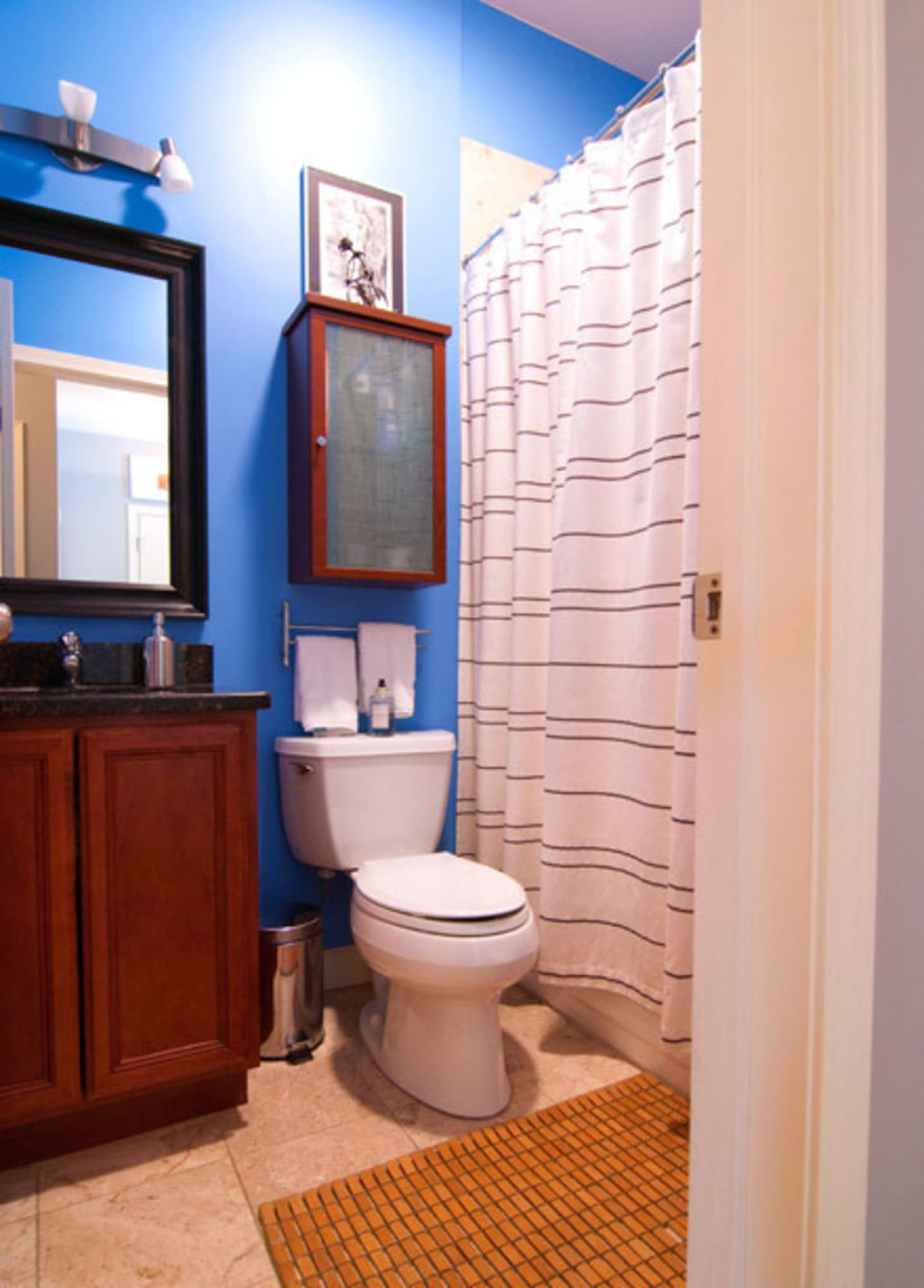A teeny tiny bathroom is the perfect place for a playful paint color since there's not room for any other decorative statements.